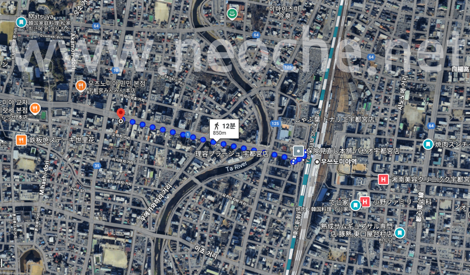 우츠노미야 역 서쪽에서 걸어서 12분, 차로 3분정도 거리이다.
